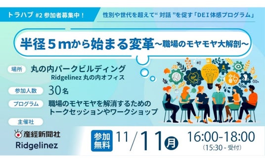 産経新聞社と総合プロフェッショナルファームのRidgelinezは、企業における DEI(多様性、公平性、包括性)推進の課題解決を目指すプログラム「DEI Transformation HUB」通称「トラハブ」に取り組んでいます。11月11日(月)には、2回目のイベント「半径5mから始まる変革~職場のモヤモヤ大解剖~」を開催。「公平性」「心理的安全性」「無意識の思い込み(アンコンシャスバイアス)」という視点を用いて職場で感じるモヤモヤした違和感を分析し、DEI実現に向けてどう行動すればいいのかを対話を通じて考えます。