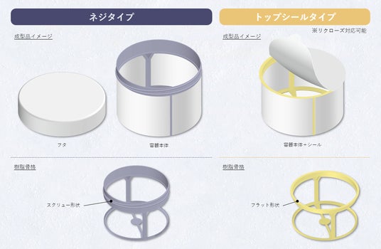 本製品は、ネジタイプとトップシールタイプの2種類の形状で提供します。ネジタイプでは、既存のキャッピング装置に専用の補助工具を付け替えることで新規設備を導入することなく、内容物の充填や蓋を閉めることが可能です。また、耐熱性樹脂を使用することで、ホット充填が必要な製品にも対応しています。