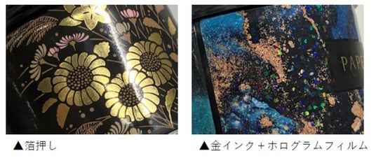 紙ラベルは、箔押しやニス加工といったプラスチック製やガラス製の容器には難しい加飾表現が可能です。また、ホログラムフィルムにも対応可能で、優れたデザイン表現を実現します。