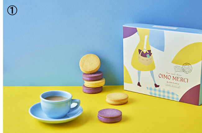〈OIMO MERCI〉1.おいもサブレサンド詰め合わせ6個入 (さつま芋・むらさき芋各3個入り)1,026円、2.おいもクレオル 1個 486円/1階 MAP2.