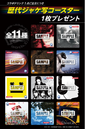 コラボドリンク注文特典として、コラボドリンク1品ご注文につき、歴代アルバムジャケットデザインのオリジナルコースター(全11種)の中からランダムで1枚プレゼントします。
