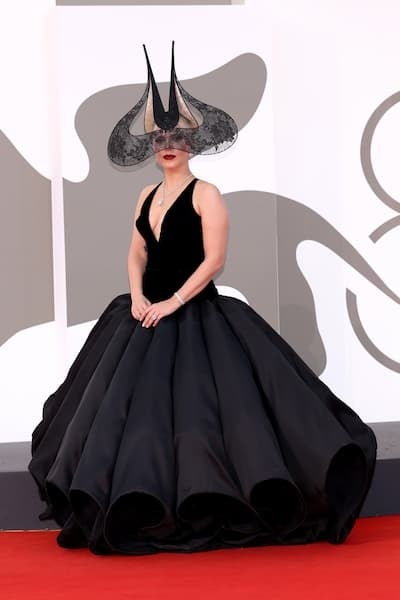 レディー・ガガは、オートクチュール コレクションからブラックベルベットのビスチェに、ブラックのシルクとベルベットのスカートを纏いました。このビスチェの製作には300時間、スカートには550時間が費やされ、完成に導かれています。