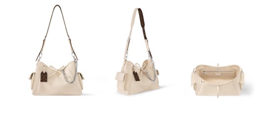 エレガントなバニラの色合いの「キャリーオール・カーゴ バイブ PM」。ラムレザーを使用し、レザーレースの留め具や、取外し可能なチェーンのディテールをはじめとする洗練されたシルバーカラーの金具をあしらいました。コントラストを描くネームタグには、アイコニックなモノグラム・パターンが施されています。