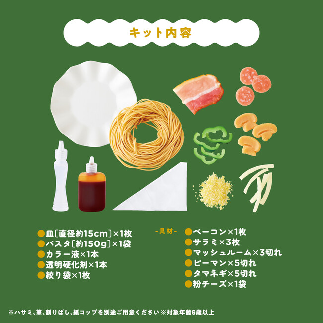 パスタをはじめとする具材はもちろん、お皿やカラー液、硬化剤も付いてきます。