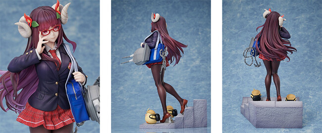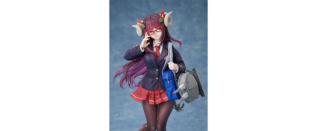 今回「F:NEX」では、重桜(じゅうおう)陣営のキャラクターである戦艦・駿河(するが)を、着せ替え衣装「文化系なんだからっ」のイラストをもとにフィギュア化。メガネに手を当てて気品高く微笑む表情はもちろん、制服のシワやスカート、髪の毛流れも丁寧に造形。ピンクのロングヘアはクリア素材を採用し、グラデーション塗装を施すことで美しい髪色を表現しました。また、ミニスカートからのぞく肉付きのよい魅力的な脚や、タイツの透け感にもこだわり制作。足元のマスコット的キャラクター・饅頭が作品の世界観をより一層引き立てます。