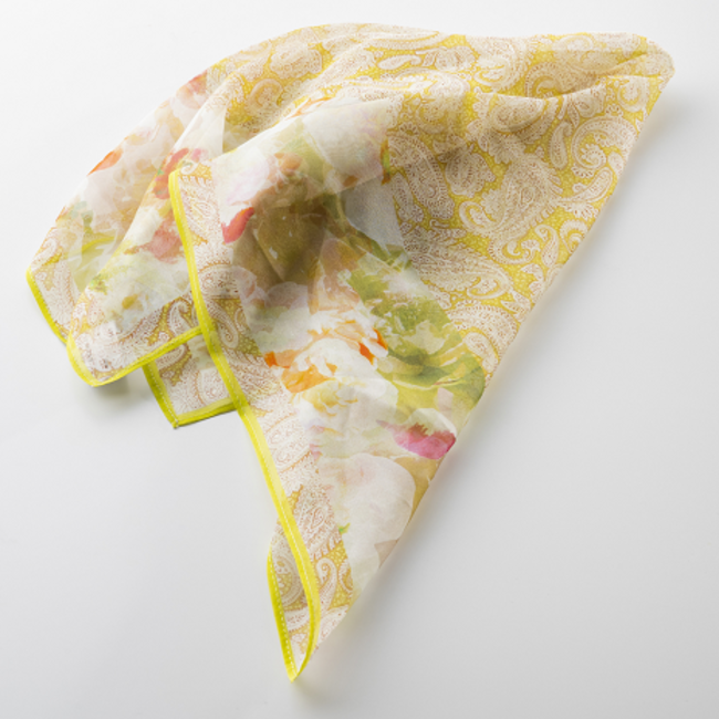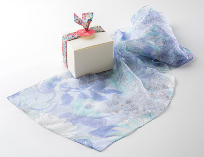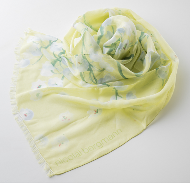 上〈フィオリトゥーラ ジョバンナ〉スカーフ 3,850円、下〈ニコライバーグマン〉幸せのシンボルの意味をもつ「すずらん」をモチーフにしたストールで愛と感謝を伝えます。ストール 9,900円