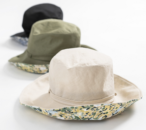 強い日差しから日焼けを防ぐ、広つば帽子。つばをめくると見える明るい花柄がさりげないアクセントに。