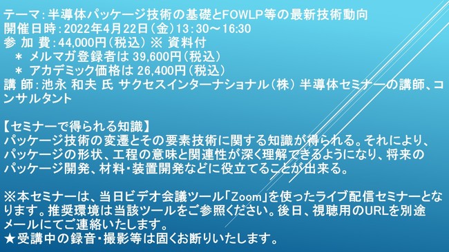 先端技術情報や市場情報を提供している(株)シーエムシー・リサーチ(千代田区神田錦町: https://cmcre.com/ )では、 各種材料・化学品などの市場動向・技術動向のセミナーや書籍発行を行っておりますが、 このたび「半導体パッケージ技術の基礎とFOWLP等の最新技術動向」と題するセミナーを、 講師に池永 和夫 氏 サクセスインターナショナル(株) 半導体セミナーの講師、コンサルタント)をお迎えし、2022年4月22日(金)13:30より、 ZOOMを利用したライブ配信で開催いたします。 受講料は、 一般:44,000円(税込)、 弊社メルマガ会員:39,600円(税込)、 アカデミック価格は26,400円(税込)となっております(資料付)。