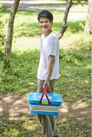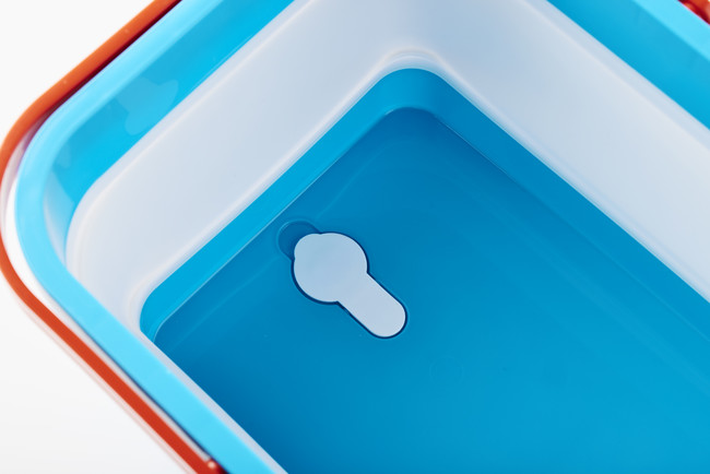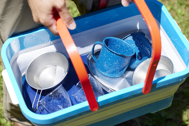 バスケットの底には、エラストマー製の水抜き栓が付いています。引き上げると穴が開いて水が抜けていくので、水を溜めて使ったときに、重いバスケットを傾けなくてOK。食器を洗ったり、夏には氷を張ってドリンクやフルーツを冷やしたりと、キャンプやピクニックでマルチに活躍します。