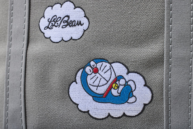 刺繍はとても繊細。雲の上で寝転ぶドラえもんと、雲の中に記されたエル・エル・ビーンのモノグラムです。