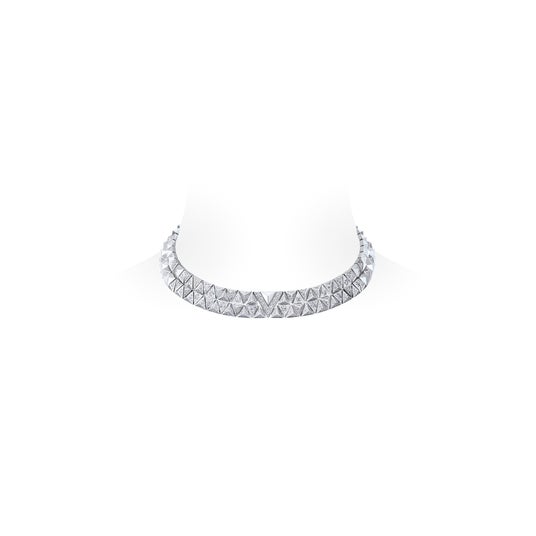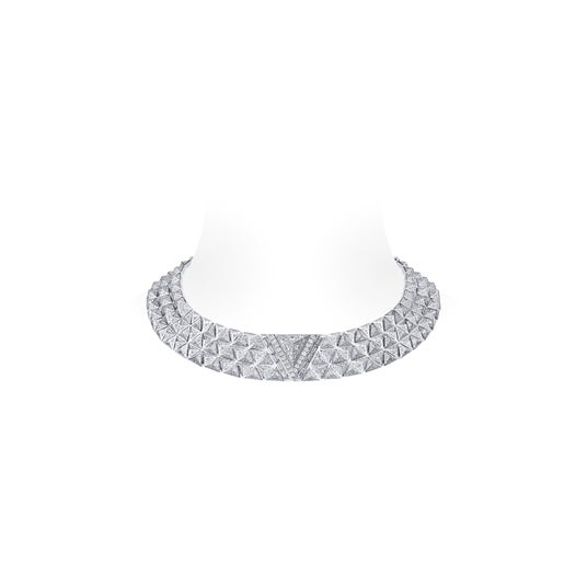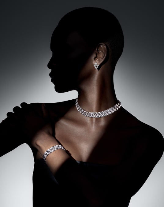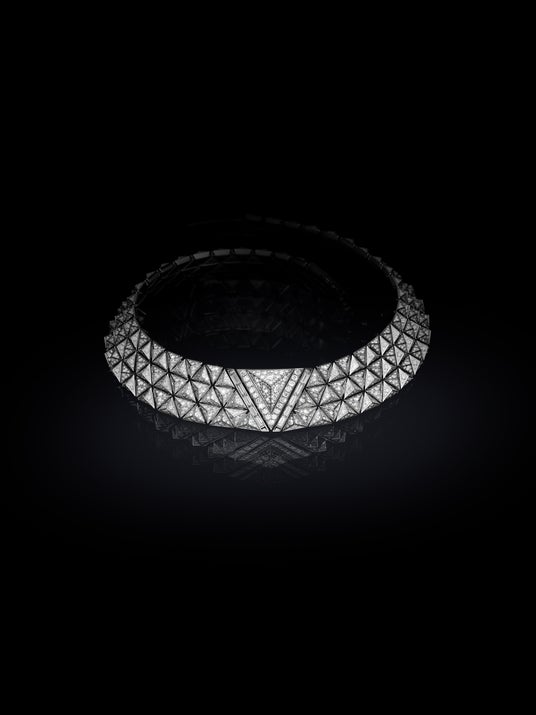 8つの新作ハイジュエリーは、大胆さと洗練の融合により、モダニズム的なアプローチによるデザインに秘められたパワーを讃えます。類い稀なダイヤモンドがまるで星座のようにきらめくこれらの作品は、宝石が織りなす光のキャンバスにあしらわれた「V」の文字が、遠近法に逆らうように立体的な構造を際立たせています。この伝説的なイニシャルが、ネックレスやブレスレット、イヤリング、そしてリングに展開され、コレクション全体に輝きをもたらします。そのグラフィカルな構造は、1つ1つのラインの正確さを導き、限りなく繰り返される中で、表面、ボリューム、プロポーションの鮮やかな相互作用を生み出します。ネックレスとブレスレットにおいては、アイコニックなモチーフのピラミッドが中央の「V」のオーナメントに視線を集め、バゲットカットのダイヤモンドが、その魅惑的なパワーをより一層強めています。