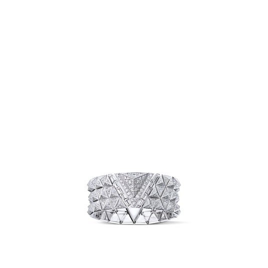 線、三角形、ピラミッドのモチーフが重なり合い、命を吹き込まれたこのプレシャスな格子細工は、その精緻な構造による驚くべきしなやかさでネックレスやブレスレットを美しく彩ります。このデザイン要素はイヤリングのフォルムにも採用されている他、彫刻的なリングの斜めのラインをなぞるように配されています。ネックレスとブレスレットは、留め具を見えないようにすることで洗練されたデザインを極め、細部にまで宿る精密な職人技が、躍動感、エネルギー、リズムを感じさせます。あらゆる次元を探求した「Pure V」の大胆なデザインはまさに、ルイ・ヴィトンのハイジュエリーならではの限りない創造性、美のボキャブラリー、専門性をこれまでにない形で表現していると言えるでしょう。