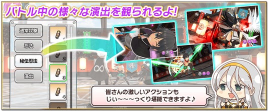 「通常攻撃」「忍法」「秘伝忍法」「演出」のそれぞれの項目から、再生したい演出を選択し「再生」ボタンを押すことで、演出が始まります!