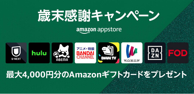 Amazonアプリストアは、本日12月15日(金)より、期間限定のAmazonアプリストア 歳末感謝キャンペーンを開始いたしました。キャンペーン期間中、Fire TVシリーズ上のAmazonアプリストアから人気の動画配信サービスのアプリをダウンロード、新規サブスクリプション登録すると、1つのサービスにつきAmazonギフトカード500円分をプレゼントいたします。年末年始のご家族や大切な人とのおうち時間に、豊富なエンターテイメントコンテンツを思う存分お楽しみください。