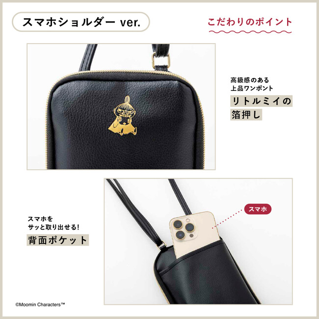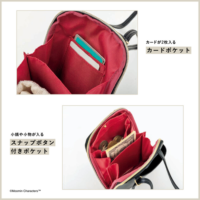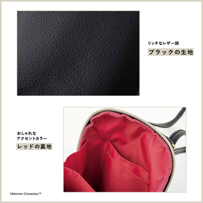 セブン-イレブン版は、コンパクトながら機能性に優れたスマホショルダー。メイン収納は仕切り付きで荷物を整理しやすく、ガバッと大きく開くじゃばら式。背面にスマホをサッと出し入れできるポケットが付いています。内側にはスナップボタン付きの小銭入れと2枚分のカードポケットもあり、お財布としての機能もバッチリ。コンパクトな見た目ながら、スマホをはじめお札、小銭、カード、鍵、リップ、ハンカチ、ティッシュなど外出に必要なものがしっかり入るので、これひとつでお出かけできます♪ こちらもブラックの生地に映えるゴールドのリトルミイの箔押しで、リッチな印象。大人に似合うレザー調の生地と、レッドの裏地が高級感のある上品なかわいさで、毎日のコーデに大活躍すること間違いなしです。