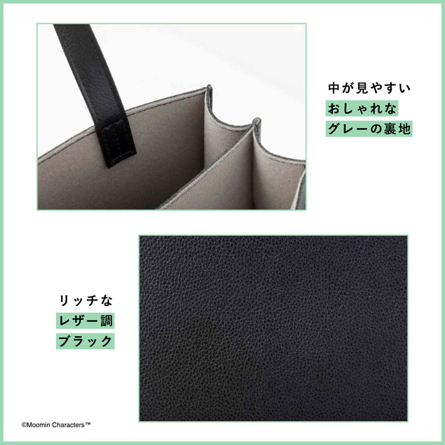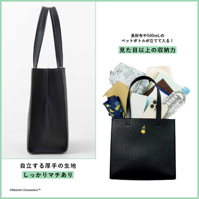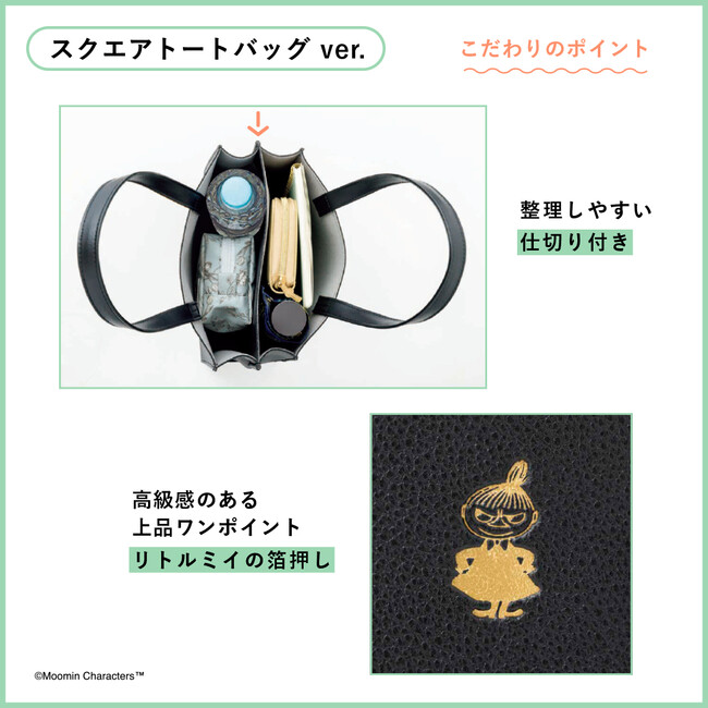 書店版は、見た目以上にたくさん入る仕切り付きのスクエアトートバッグ。バッグは中央に仕切りが付いているので、荷物がバッグのなかで散らかりにくく、整理されたきれいな状態を保てます。マチがたっぷりあるから、長財布や折りたたみ傘、メイクポーチなど、お出かけの必需品がすっぽり。500mLのペットボトルも縦に入れられます。 デザインは、シックなブラックのレザー調にゴールドの箔押しで高級感たっぷり。箔押しのリトルミイが大人かわいいアクセントになっています。持つだけでおしゃれ度がぐっと上がる、大人が持ちたい上品でリッチなバッグに仕上がりました。