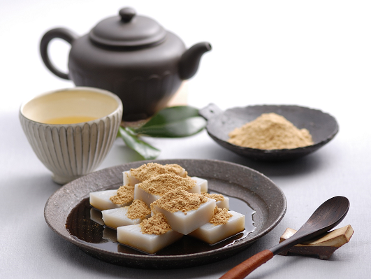 450日熟成乳酸発酵した小麦のでんぷんを1つ1つ丁寧に蒸し上げました。船橋屋秘伝の黒糖蜜と粗く挽いた香ばしい黄な粉をかけてお召上がりください。