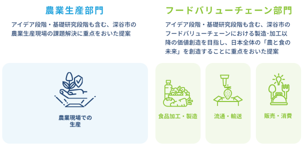 本コンテストでは農業生産過程におけるアイデアを対象とした「農業生産部門」と、フードバリューチェーン過程(生産過程を除く)におけるアイデアを対象とした「フードバリューチェーン部門」の2部門を設け、農業課題の解決に繋がる提案を幅広く募集します。そして、未来の農業を創るアイデアの実現に向けて、深谷市が伴走支援を行います。