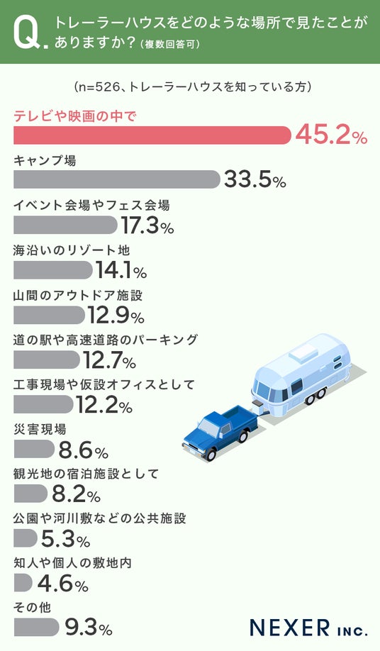 続いて、トレーラーハウスをどのような場所で見たことがあるか聞いてみました。
