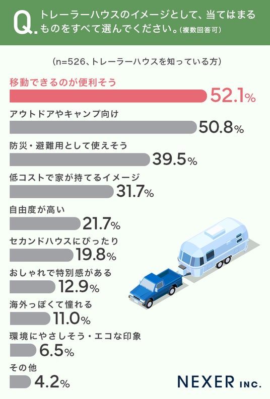 ■52.1%が、トレーラーハウスのイメージ「移動できるのが便利そう」