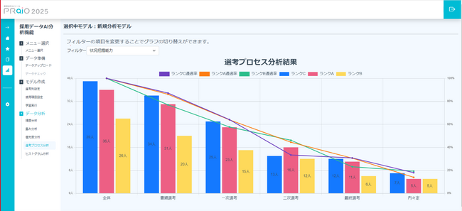 新機能「採用データAI分析」では、学生情報や採用イベントの参加有無や参加満足度、選考参加有無や選考通過率、社員評価などのあらゆるデータをAIによって分析し、「自社の弱みはどのフェーズにあったのか」「どのイベントに参加した学生が、何に魅力を感じ、なぜ本選考に参加したのか」などの情報が表やグラフで可視化されます。この分析結果をもとに課題の原因を特定することができ、自社の採用課題の可視化・言語化にもつながります。