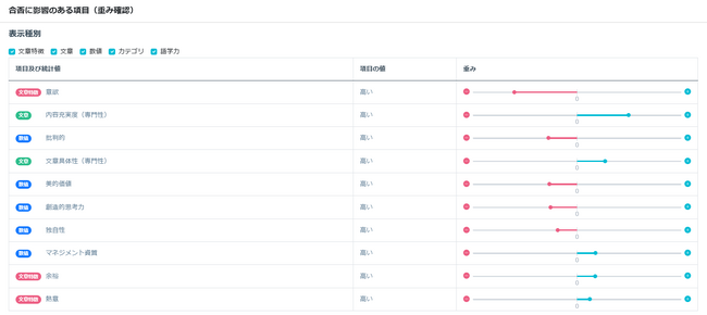「文章特徴診断」「ワードサマリ」:ESに用いられている単語や記述量などを可視化する機能