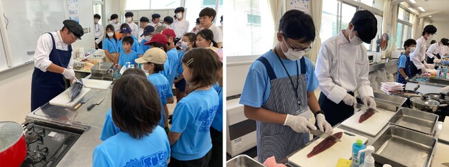 続いては、「カツオ」の料理体験です。まずは小名浜海星高校の斎藤先生による、「カツオ」の解体ショーが行われ、「カツオ」をさばく手順や、さばく上での注意点を教えてもらいました。その後は、小名浜海星高校の水産クラブ調理チームの方に協力してもらいながら、「カツオの肉巻き」を調理しました。こちらの料理は株式会社マルト商事と福島県立小名浜海星高校水産クラブ調理チームのコラボプロジェクトが、今回のイベントの為に、考えたオリジナルメニューになります。参加した子供たちは、本イベントの最終日では、マルトで販売される際のパッケージデザインを考える予定です。