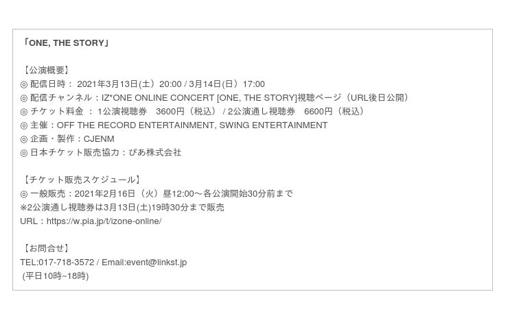 IZ*ONE オンラインコンサート「ONE, THE STORY」は、3月13日(土)20:00、14日(日)17:00より生配信される。「IZ*ONE ONLINE CONCERT [ONE, THE STORY]」視聴ページにて視聴可能。チケットは、チケットぴあにて発売中。