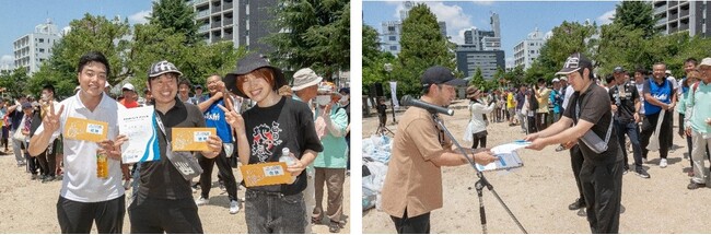 友人同士で参加したチームや学校や職場の仲間同士で参加したチーム、ご家族で参加したチームなど、県内外から多くのチームが参加しました。どのチームも気合十分で、スタート前の作戦タイムでは「どのルートを回れば効率的にごみを拾うことができるか」「役割分担をどうするか」など、意見を出し合いながら各チーム思い思いの作戦を話し合っていました。その後、出場者を代表してアサヒ飲料チームの代表者が登壇し選手宣誓を行った後、「CHANGE FOR THE BLUE」の掛け声で全チーム一斉にスタート。60分の激闘を繰り広げました。街には多くの空き缶、たばこの吸い殻、ナイロン袋、家庭ごみなど様々なごみが落ちており、参加者は競技に参加しながら、街に捨てられているごみの多さを改めて実感しているようでした。
