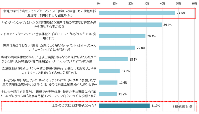 2025年卒から改正された「インターンシップ」の定義について、知っているものを選択してもらったところ、「特定の条件を満たしたインターンシップに参加した場合、その情報が採用選考に利用される可能性がある」の認知度が最も高く47.9%で、次いで、「『インターンシップ』というには実施期間や就業体験の有無など特定の条件を満たす必要がある」が39.4%となった。インターンシップが「採用選考の結果に直接関係する可能性がある」という点に注目しているようだ。【図3】