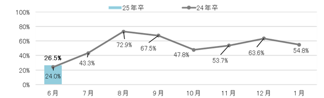 2025年卒の学生に6月時点でインターンシップ仕事体験への参加経験を聞いたところ、累積参加率は前年比10.9pt増の39.8%で、6月単月の参加率は前年比2.5pt増の26.5%だった。インターンシップ・仕事体験に対する関心は年々高まっていたが、2025年卒からはインターンシップの定義が改正されることもあり、特に早いタイミングで学生の関心を集めたと思われる。【図1、2】