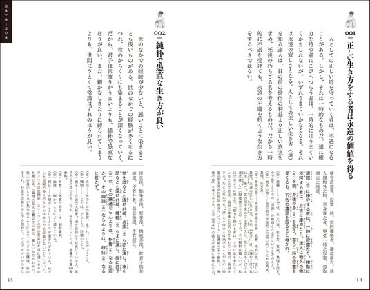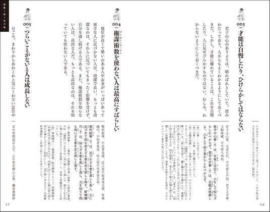 処世術だけを部分訳したビジネス本、子ども向けの超訳本など、これまでにさまざまなアプローチで紹介されてきましたが、全文を原文、書き下し文とともに網羅した本は数少ない。