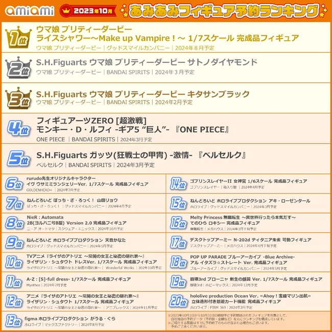 ホビーショップ『あみあみ』の「2023年10月フィギュア予約ランキング」を発表!