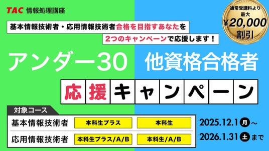 情報処理技術者試験、公認会計士、公務員、日商簿記検定、CompTIAなどの資格取得に向けた教育サービスを展開しているTAC株式会社(東京都千代田区、代表取締役社長:多田 敏男)は、30歳以下の方を対象とした「U30応援キャンペーン」、他資格合格者を対象とした「他資格合格者応援キャンペーン」を実施中です。人気の基本情報技術者「本科生プラス」「本科生」、応用情報技術者「本科生プラス/A/B」「本科生/A/B」を大幅割引でお申し込みできます。割引キャンペーンはいずれも2026年1月31日(土)までの期間限定です。