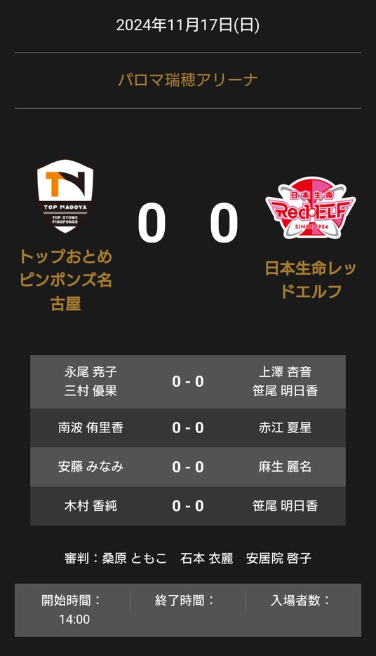 ノジマTリーグ 2024-2025 公式戦 11月17日開催 の「トップおとめピンポンズ名古屋 vs 日本生命レッドエルフ」のオーダーを発表いたします。