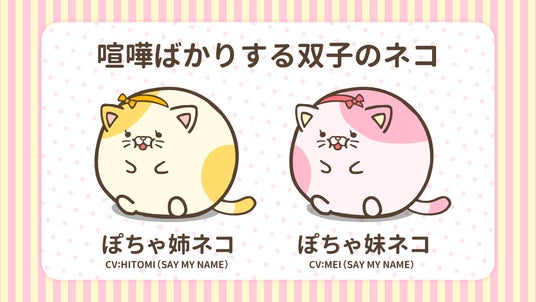 新たに登場する新キャラクター「ぽちゃ姉ネコ」、「ぽちゃ妹ネコ」は、双子なのに気が合わないネコの姉妹です。「ぽちゃ姉ネコ」をHITOMIが、「ぽちゃ妹ネコ」をMEIがそれぞれ演じます。