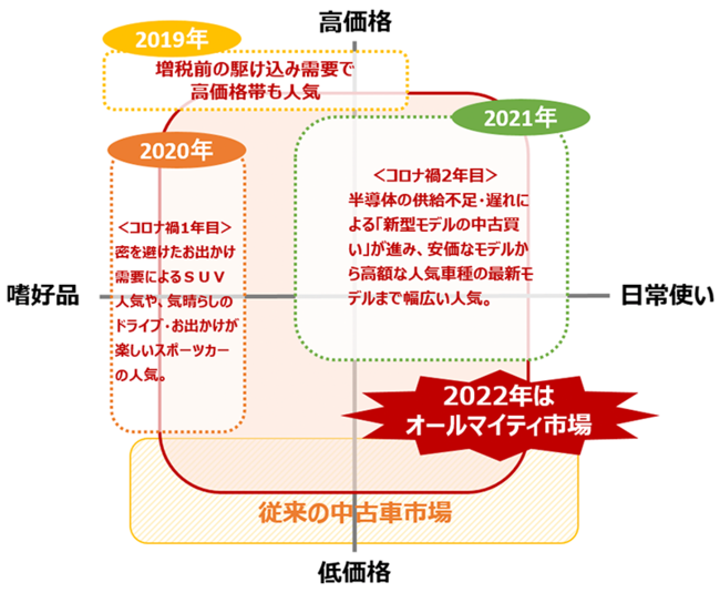 下図の通り、2019年は消費税増税前の駆け込み、2020年はコロナ禍1年目、2021年も引き続きコロナにより主に半導体不足による新車市場からの影響を受けた特殊な3年間を過ごしてきました。これら世の中の特殊な事情と、その少し前から徐々に拡大していた残価設定ローンや認定中古車などの販売戦略の変化が加わり、いよいよ中古車市場がオールマイティな市場に変化し始めていると言えそうです。“新車 VS 中古車”と対立構造で語られがちだった価値観もアップデートされ、現行型など新車で購入可能なモデルも中古車を同時に検討する層が増えてきています。また、嗜好品などでは新車時を超える価格で流通する新旧のモデルも多く、世界的な中古車市場の活性化が見て取れます。従来の、“中古車=安かろう悪かろう”というイメージはどんどん払拭され、一定年数や距離を走った廉価な中古車はもちろん、嗜好品や高年式で総額や新車時価格と比べても価格が変わらないorより高くなっているモデルがこれからも市場を活性化していくことが予想されます。