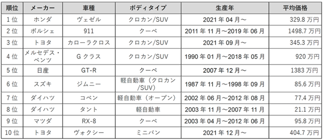 2022年は、昨年発売されたばかりの現行モデル「ホンダ ヴェゼル」が栄冠に輝きました。その他、10位以内には昨年に引き続きSUVやスポーツカー(クーペ、オープン)が上位にランクインしています。昨年と比較すると、現行型だけでなく、世代が前のモデルも含んだ新旧バラエティに富むランキングとなっております。