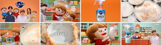 食器を洗っている最中に、子どもから「ママ、遊ぼう」と声をかけられ、家事に追われながらも、子どもの気持ちに応えてあげたいお父さんとお母さん。そこで本商品を使って「泡パックして、ほったらかし!」にしている間に、大切な家族と過ごす様子を描いています。