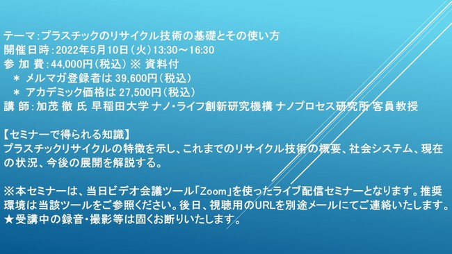 先端技術情報や市場情報を提供している(株)シーエムシー・リサーチ(千代田区神田錦町: https://cmcre.com/ )では、 各種材料・化学品などの市場動向・技術動向のセミナーや書籍発行を行っておりますが、 このたび「プラスチックのリサイクル技術の基礎とその使い方」と題するセミナーを、 講師に加茂 徹 氏 早稲田大学 ナノ・ライフ創新研究機構 ナノプロセス研究所 客員教授)をお迎えし、2022年5月10日(火)13:30より、 ZOOMを利用したライブ配信で開催いたします。 受講料は、 一般:44,000円(税込)、 弊社メルマガ会員:39,600円(税込)、 アカデミック価格は27,500円(税込)となっております(資料付)。