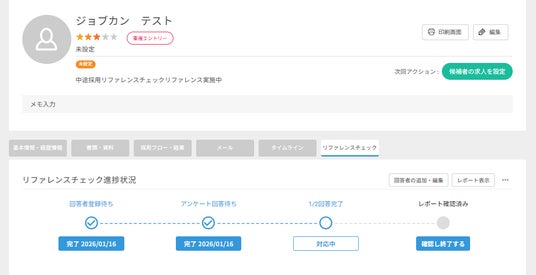 株式会社DONUTS(東京都渋谷区、代表取締役:西村啓成)が提供するクラウド型採用管理システム『ジョブカン採用管理』は、2026年2月24日(火)に「リファレンスチェック機能」のオプション提供を開始しました。これにより、リファレンスチェックの依頼から収集・管理までの一連の作業を『ジョブカン採用管理』でスムーズに実現できます。