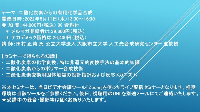 先端技術情報や市場情報を提供している(株)シーエムシー・リサーチ(千代田区神田錦町: https://cmcre.com/ )では、 各種材料・化学品などの市場動向・技術動向のセミナーや書籍発行を行っておりますが、 このたび「二酸化炭素からの有用化学品合成」と題するセミナーを、 講師に田村 正純 氏 公立大学法人 大阪市立大学 人工光合成研究センター 准教授)をお迎えし、2022年5月11日(水)13:30より、 ZOOMを利用したライブ配信で開催いたします。 受講料は、 一般:44,000円(税込)、 弊社メルマガ会員:39,600円(税込)、 アカデミック価格は26,400円(税込)となっております(資料付)。
