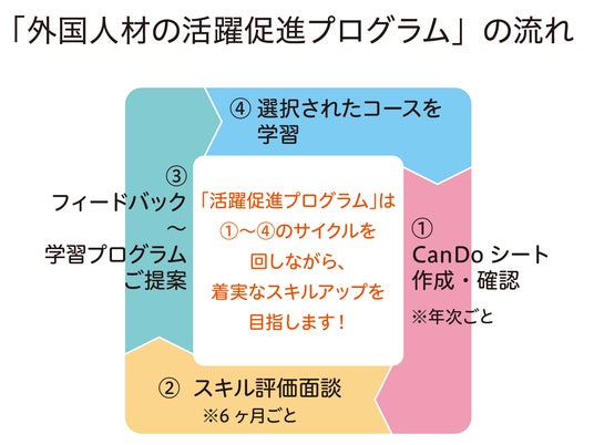 これらの課題を解決するため、当社は介護施設向けに「外国人材の活躍促進プログラム」の提供を開始します。これは外国人スタッフ一人ひとりの状況を把握した上でそれぞれに最適な「日本語」「介護技術」の学習プランをご提案し、学習進捗を管理・共有するものです。スタッフはスマホやタブレット等で学習、スキル評価をフィードバックし、目標に向けて着実なスキルアップをめざしていきます。今回の無料オンラインセミナー「外国人介護人材は『コスト』か『資産』か?施設経営を強化する人材育成サイクル『4つの鍵』とは」では、具体的な課題の解決のためにこのプログラムをどう活用できるか、詳しく解説いたします。