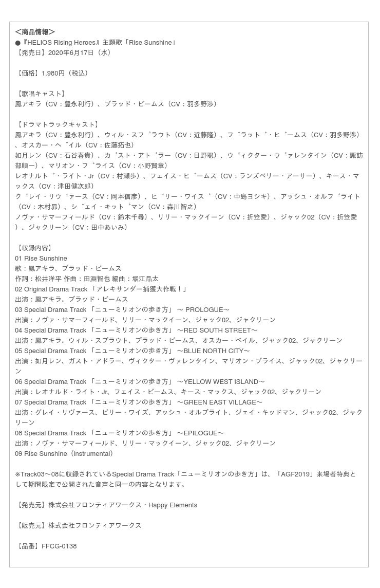 Happy Elements カカリアスタジオが贈る新作ゲーム『HELIOS Rising Heroes』より、2020年6月17日(水)に発売される主題歌CD「Rise Sunshine」のアニメイト予約キャンペーン特典デザインが公開されました!