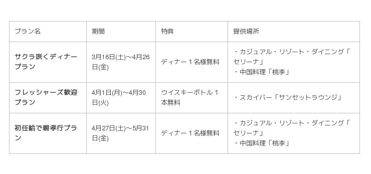 ホテル日航成田(成田市:総支配人 吉高誠)では、卒業や入学、就職される方々を応援する「フレッシャーズ応援フェア」を2019年3月16日(土)から5月31日(金)まで、各レストラン、バーにて実施いたします。ディナーが1名様無料となる「サクラ咲くディナープラン」と「初任給で親孝行プラン」、お好きなウイスキーボトルが1本無料となる「フレッシャーズ歓迎プラン」の3種のプランをご用意いたしました。