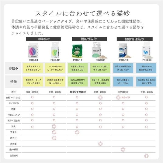 PEKITでは現在2種類の猫砂、ベーシックな「PKCL04/ミックス猫砂」と健康管理ができる「PKCL08/血尿検知猫砂」を販売中。新商品4種類が追加され、合計8種類の充実のラインナップになりました。ぜひ快適な自動猫トイレライフをお送りください。