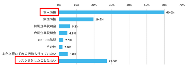 6割の学生が「個人面接」はマスクを外して参加。一方で27.3%が「マスクを外したことはない」と回答【図3】