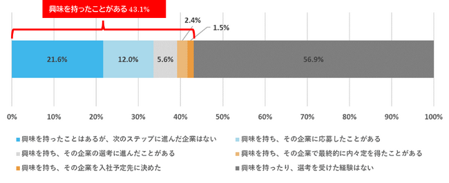 SNS等でシェアされた企業に対するポジティブな投稿を目にしたことで、その企業に興味を持ったり選考を受けたことがあるかを聞いたところ、最も多かったのは「興味を持ったり、選考を受けた経験はない」(56.9%)であったものの、「興味を持った」と答えた割合も43.1%となった。そのうち「応募したことがある」という回答は12.0%で、「選考に進んだことがある」は5.6%、中には「その企業を入社予定先に決めた」(1.5%)という回答もあった。【図5】
