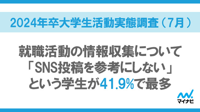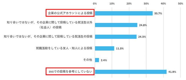 就職活動の情報収集について「SNS投稿を参考にしない」という学生が41.9%で最多。SNSを参考にする際に見るのは「企業の公式アカウントによる投稿」が33.7%。