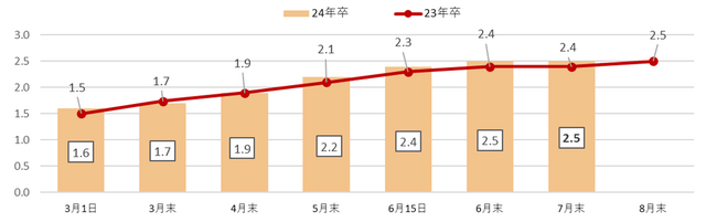 2024年卒業予定の大学生・大学院生の7月末時点での内々定率は前月比2.4pt増の81.9%で、平均内々定保有社数は前月同値の2.5 社となった。企業の高い採用意欲を背景に、6月同様、内々定率・平均内々定保有社数ともに高い割合で推移している。【図1、2】